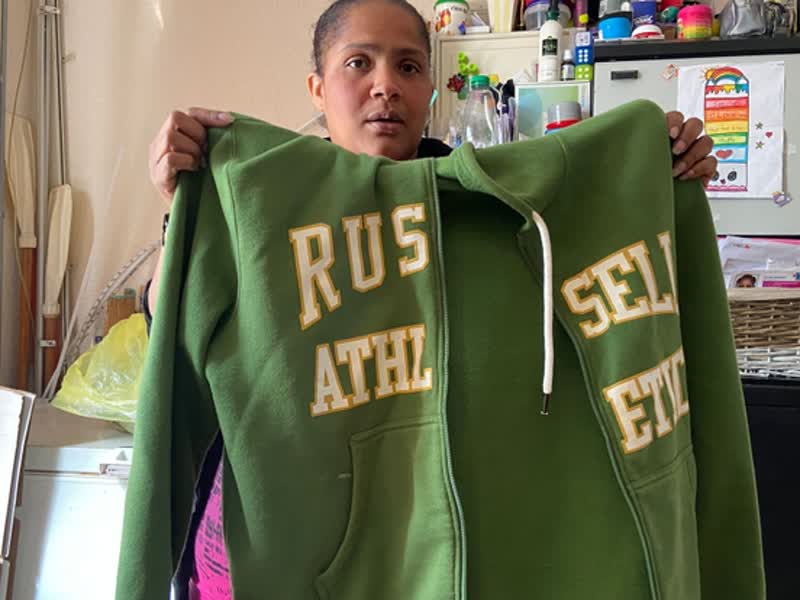 Onlangs was Mia Hansen bepaald niet de schrik van de buurt. Ze vond een tas met nog puntgave kleding van de merken Russell Athletic en Puma in haar achtertuin. "Ik heb aan iedereen gevraagd van wie het was, maar niemand wist het", lacht ze. "Mensen hier in de buurt weten als ze wat nodig hebben: ik ga naar Mia, die kan me misschien wel helpen. Ik krijg soms tweedehands kleding en die geef ik weer door. Als mensen wat willen weggooien neem ik het soms mee. Kijk hier, net gehad: kussens voor tuinstoelen in een mooie hoes. De kleren check ik trouwens altijd wel altijd eerst op vlekken"