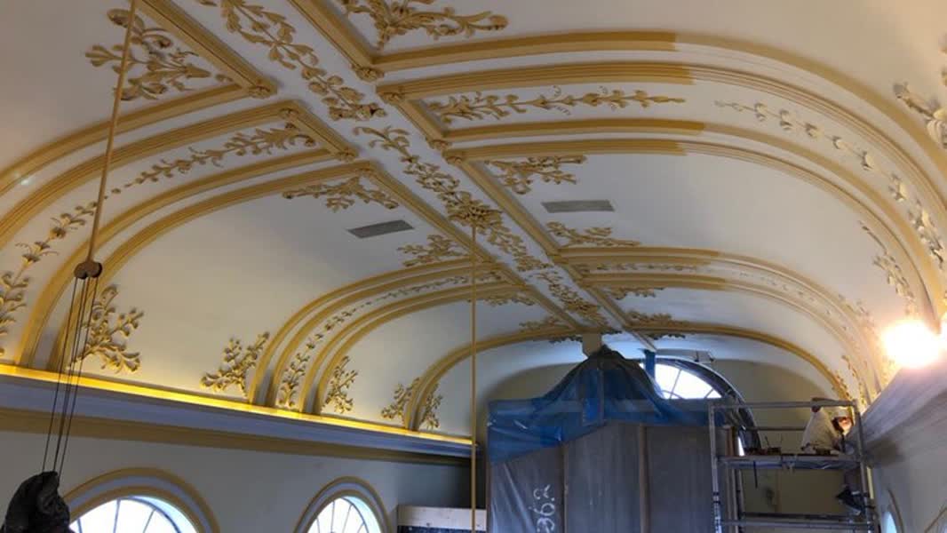 Het gebouw zelf stamt uit 1843 en was al er al een tijd slecht aan toe. De kleuren waren verbleekt en zowel in de muren als het plafond zat het vol met scheuren. "Hier was ruim 40 jaar niks aan gedaan, en dat was wel te zien", constateert Kevin Bloom, die verantwoordelijk is voor de schilderwerkzaamheden.