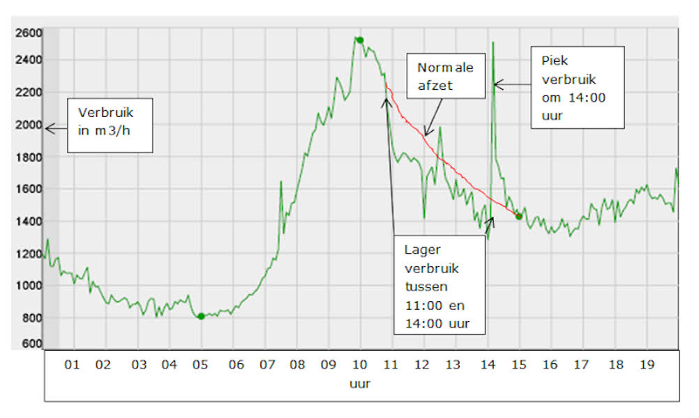 (Illustratie: Kraanwaterverbruik in Dordrecht tijdens Koningsdag, in aantal m3 (kuub, 1000 liter) per uur. www.evides.nl)