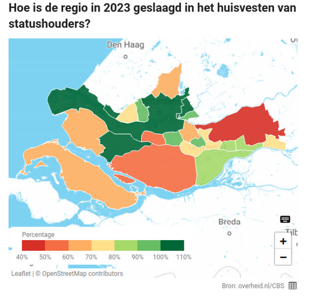 Van der Burg is wel erg tevreden over Vlaardingen en Dordrecht. "Vlaardingen heeft duizend mensen onderdak gebracht. Echt heel erg goed gedaan. Ik leverde net wat kritiek op Rotterdam. Binnen Zuid-Holland zie je enorme verschillen. Ook Dordrecht en Leiden doen het heel erg goed. Maar er zijn ook gebieden in Zuid-Holland die nog wat kunnen leren van hun buren."