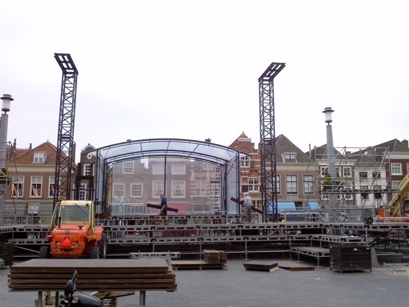 Op het Statenplein is een groot podium opgebouwd voor Koningsdag.