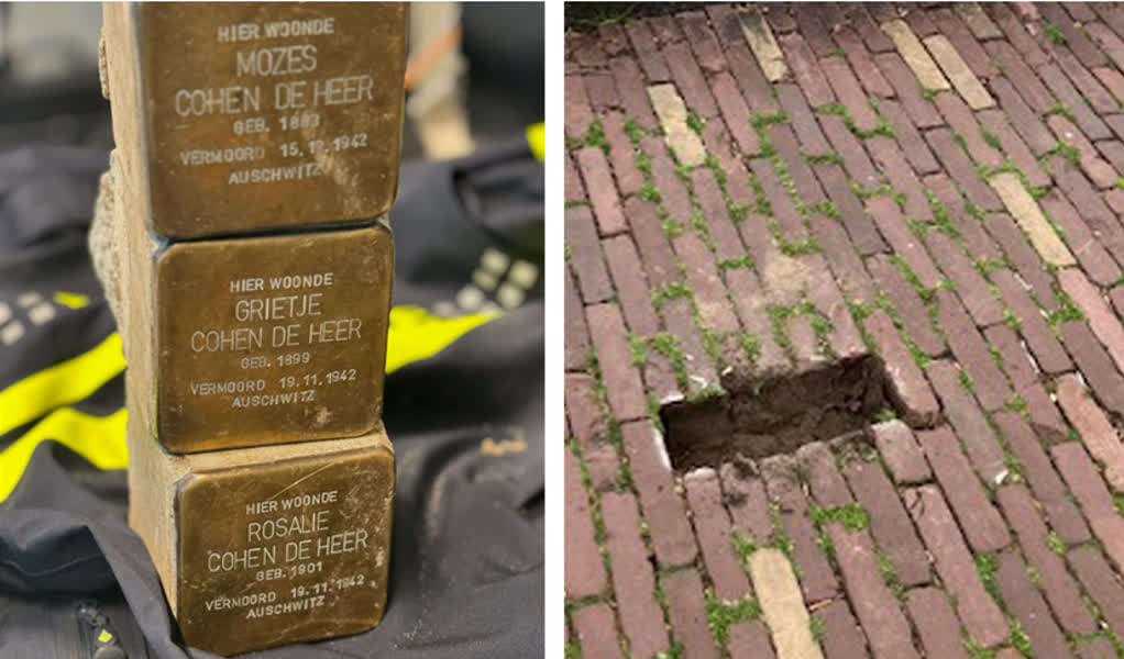 De drie verdwenen struikelstenen zijn terug op de plek waar ze uit de stoep zijn gewrikt. Maandagoch...