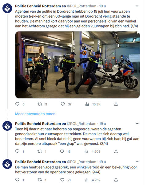 De man in de scootmobiel werd vervolgens vanuit een nabijgelegen supermarkt in de gaten gehouden door de agenten. Op het moment dat hij veilig buiten was, riepen ze hem aan. Daar reageerde de man echter niet op en de politie voelde zich genoodzaakt om hun vuurwapen te trekken. Daar reageerde hij wel op. Al snel kwamen de agenten erachter dat de man helemaal geen wapen bij zich had en dat het een ‘grap’ was.