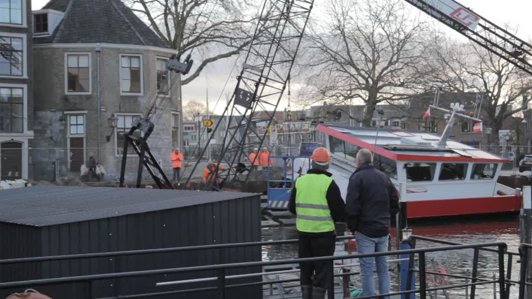 Het ponton met daarop een kraan, en een werkschip liggen inmiddels stabiel. Er is geen gevaar voor omliggende woningen en jachten. Dat zegt de gemeente. Naar de oorzaak van het lek raken wordt nog gezocht. Alles staat nog wel schots en scheef. De haven is te klein om alles met een bok recht te hijsen.