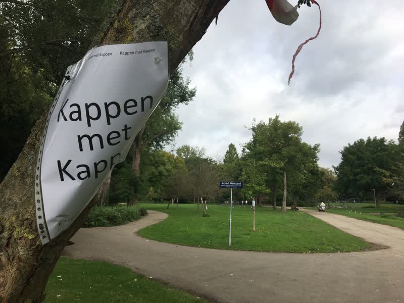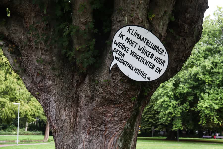 Actievoerders hebben posters opgehangen in het Weizigtpark in Dordrecht. Zij protesteren daarmee tegen het plan van de gemeente om 118 bomen te kappen als onderdeel van een grote opknapbeurt van het park.