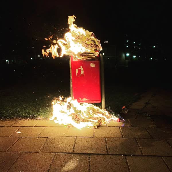 De vuilnisbak is woensdag eerst volgepropt met papier waarna hij met behulp van een fles wasbenzine in brand is gestoken.