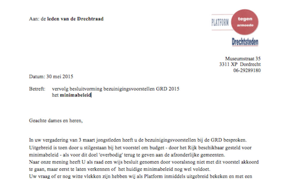 De partij onderschrijft hiermee een pleidooi van Platform Tegen Armoede Drechtsteden. Het Platform heeft de Drechtraad een open brief gestuurd met de uitkomsten van onderzoek naar armoede en mogelijke oplossingen daarvoor. Het Platform komt tot de conclusie dat "de meeste minimahuishoudens maandelijks geld tekort komen voor het betalen van hun vaste lasten en basisbehoeften. Ondanks de landelijke en gemeentelijke regelingen.” En: “Het gemeentelijk minimabeleid compenseert dit tekort maar gedeeltelijk.”