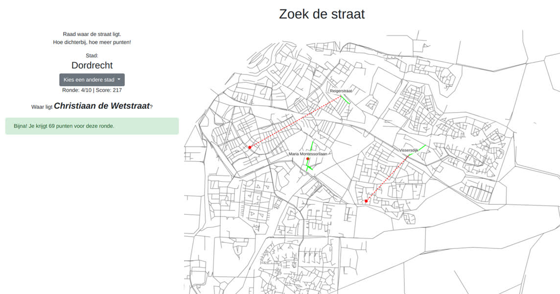 Hoe goed is jouw kennis over waar de Dordtse straten liggen? Datajournalist Wouter van Dijke maakte 'Zoek de Straat', een online spelletje die duidelijk maakt hoe het gesteld is met de stratenkennis van bewoners.Tien rondesPer ronde (van de tien) verdien je honderd punten als je de juiste straat weet te vinden. Maar denk je dat de Baanhoekweg of de Stadspolderring op de Dordtse Kil ligt? Helaas, geen punten.In totaal zijn er 782 straten in de stad in het spel opgenomen. Wegen korter dan 150 meter, maken hier geen onderdeel van uit. Wat de quiz lastig maakt, is dat je alleen maar lijntjes ziet als straatpatroon. Geen satellietbeelden, geen andere vormen van hulp. Maximaal duizend puntenDe echte kenner van de straatnamen op het eiland kan maximaal duizend punten krijgen. Wil jij een poging wagen? Test hier je kennis over waar de Dordtse straten liggen!