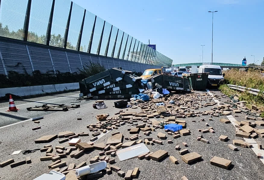 Op de A16 bij Dordrecht ter hoogte met de aansluiting van de N3 is dinsdagochtend een vrachtwagen gekanteld. Daarbij zijn meerdere met steen en puin geladen containers op de weg beland.