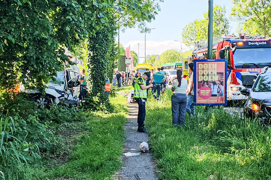 Een bestelbus is donderdagmiddag van de weg geraakt en tegen een boom geklapt langs de Provincialeweg in Dordrecht. Het ongeluk gebeurde in de richting van Stadspolders.