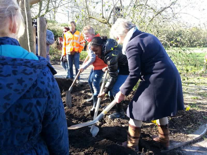 De ochtend start met zelfgeschreven gedichten van de leerlingen van de Regenboogschool aan de Noordendijk, over het belang van het behoud van bomen. Daarna zet wethouder Reynvaan, samen met twee leerlingen van de christelijke basisschool, de eerste schop in de aarde. De leerlingen bedekken de kluiten van de overige 23 bomen zelf. De wethouder vindt het een belangrijke dag: "Ze zijn meer betrokken bij de natuur, ze weten iets over bomen", aldus Reynvaan. "De meeste leerlingen wonen hier in de buurt en komen in dit park, dus die weten dan ook iets meer van de achtergrond."