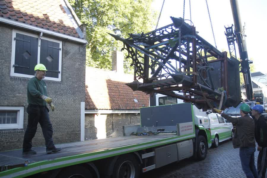 De gietijzeren bovenkant van de waterput in het Arend Maartenshof wordt gerestaureerd. Met een hijskraan werd de bovenkant vandaag uit het hof getild.