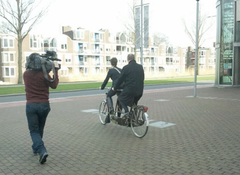 Samen met Elo de Mul, hoofd dienstverlening, stapt hij op de fiets en brengt een bezoek aan 8 stembureaus verspreid over de stad.