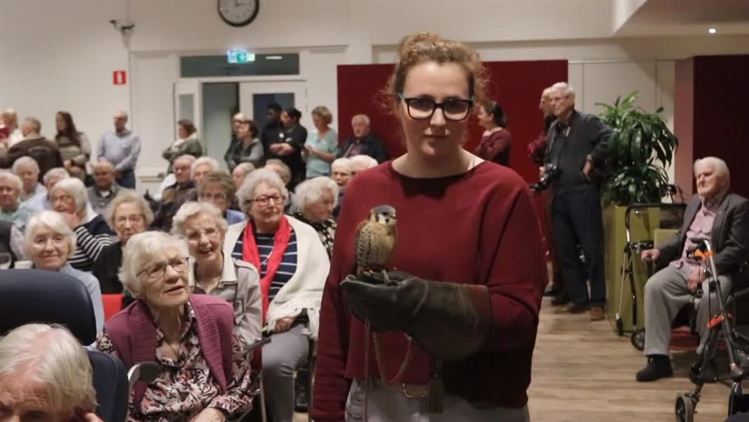 Verschillende soorten roofvogels vlogen woensdagmiddag van links naar rechts door de theaterzaal van zorg- en wooncentrum de Merwelanden. Er werd een roofvogeldemonstratie gegeven van de valkeniers van De Valkenhof.