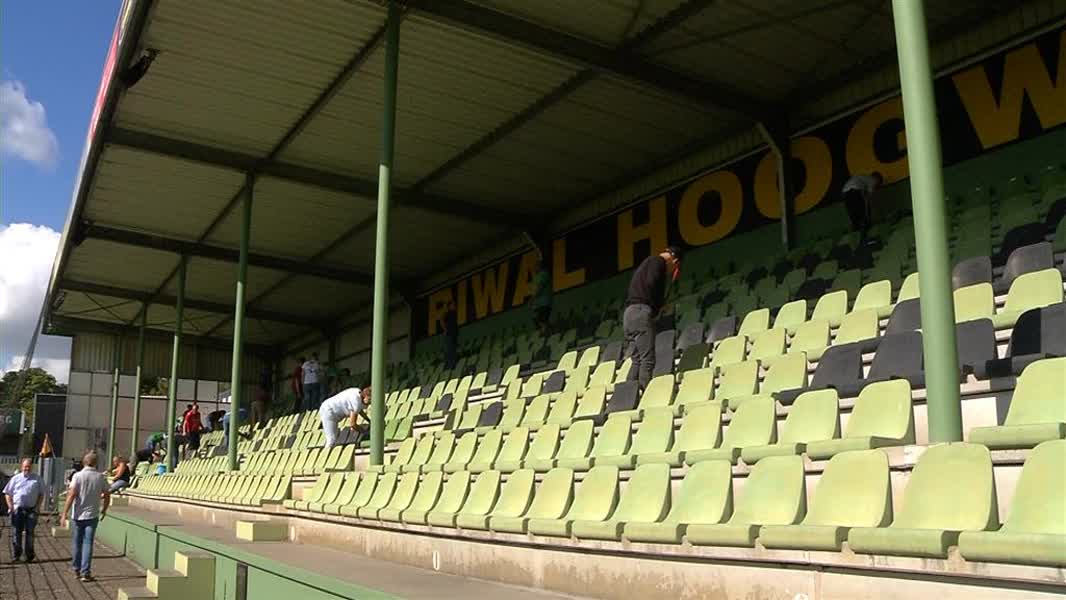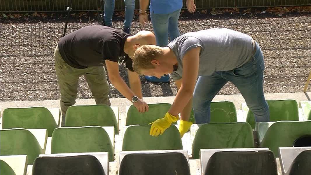 Zo'n dertig supporters kwamen naar het stadion aan de Krommedijk om vooruitlopend op de eerste competitiewedstrijd, aanstaande vrijdag, de westzijde van het stadion schoon te maken. Voor het derde jaar doen ze het nu en het aantal vrijwilligers is met de jaren toegenomen, aldus de aanjager van deze schoonmaakactie, Frank Berkhout. "Het is een mooie manier om zo met z'n alle bezig te zijn. Het eerste jaar waren we hier met een man of vijftien, vorig jaar twintig, en nu zijn we met ruim dertig man bezig de west-tribune schoon te maken. Misschien volgend jaar met een man of vijftig en dan kunnen we het hele stadion onder handen nemen".