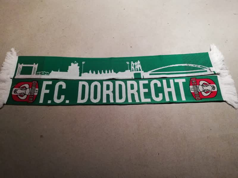 Supporters van FC Dordrecht kunnen vanaf maandagavond met een nieuwe sjaal om hun nek hun club aanmoedigen. Een groen exemplaar met het logo van de Schapenkoppen en met de skyline van de stad.