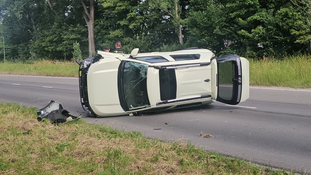 Auto belandt op zijkant na botsing