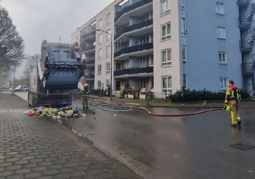 Brand in vuilniswagen, afval op straat