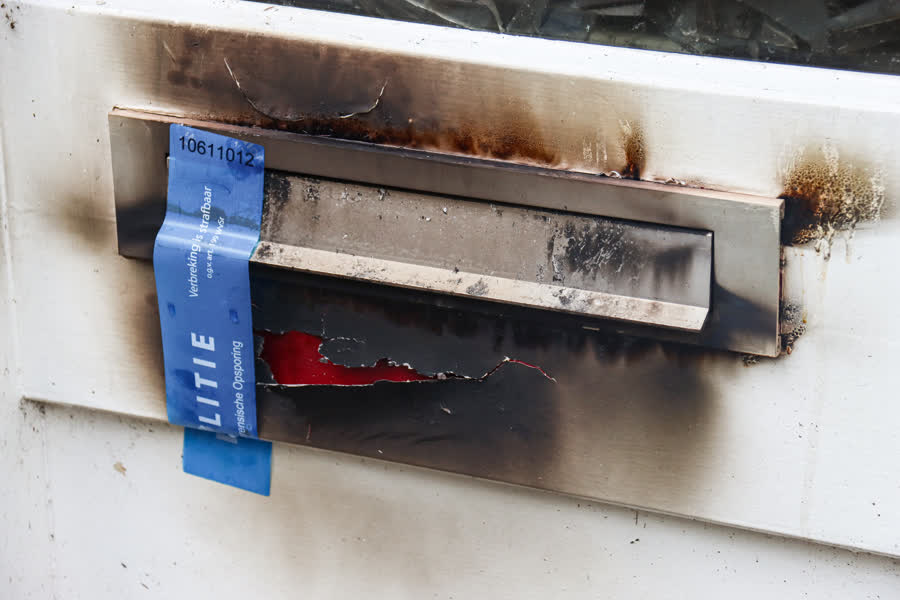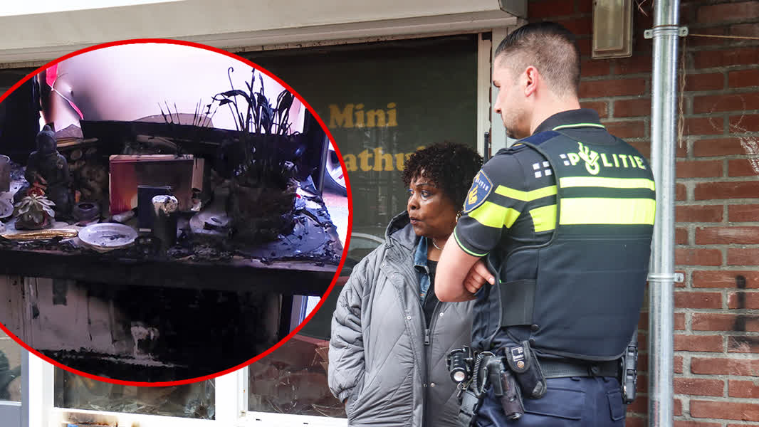Het vuur is al snel onder controle, maar de schade is groot. De ruiten zijn beschadigd, de muur zwartgeblakerd en op de grond liggen veel verbrande spullen. "Het is klote."