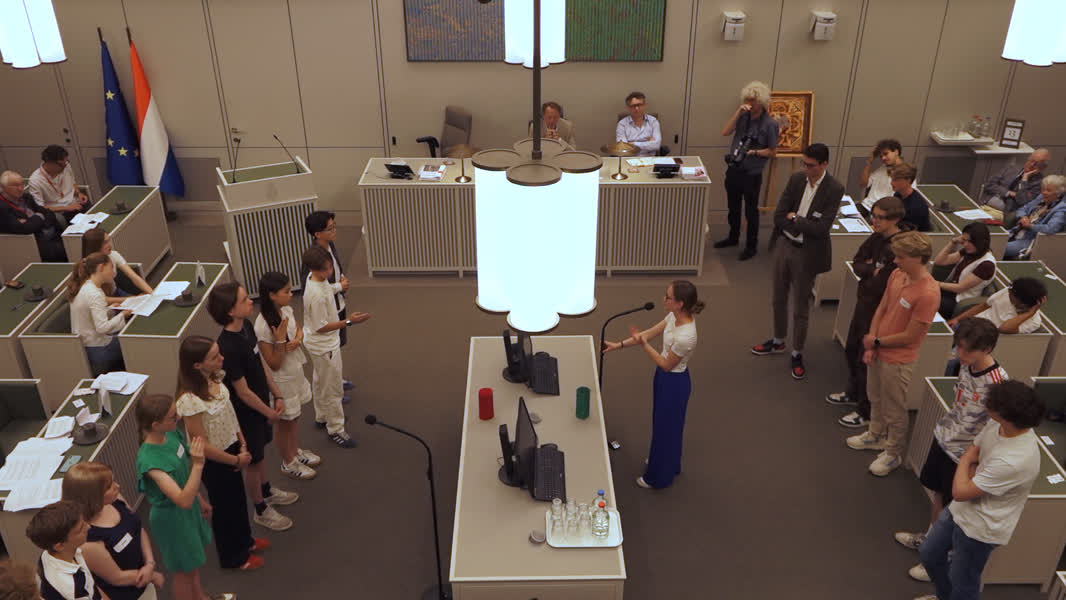 Op de plek waar normaal wetten worden goedgekeurd door senatoren van landelijke partijen, staan op de vrijdagochtend opeens tientallen jonge scholieren. Ze komen vanuit Den Haag, Utrecht, Leiden en jawél, ook Dordrecht. Ze zijn naar Den Haag gekomen op uitnodiging van Bibliotheek AanZet en de historische vereniging Vrienden van De Witt.
