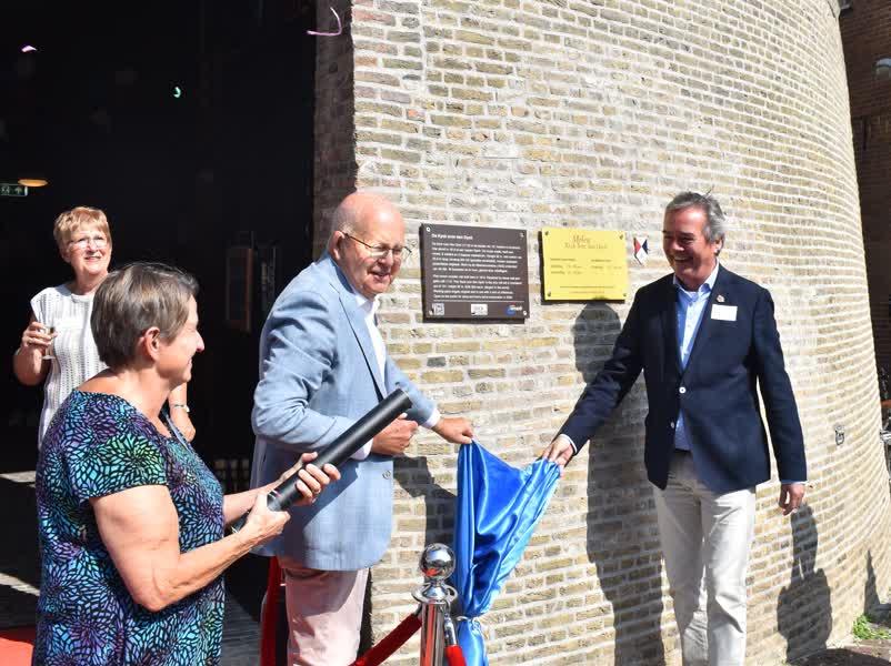 Gedeputeerde Meindert Stolk (r) onthult met voorzitter Oostenrijk het nieuwe monumentenbord Kyck over den Dyck