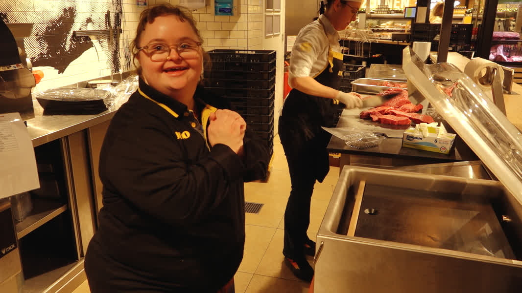 Fiona (35) is een van de deelnemers en is erg blij om te mogen werken in de supermarkt. Ze helpt met vlees inpakken en dat gaat haar goed af. "Of het moeilijk is?", is haar antwoord op onze vraag. "Nee, dat is het niet", zegt ze resoluut en zelfverzekerd. "Het leukste vind ik om achter de kassa te werken."