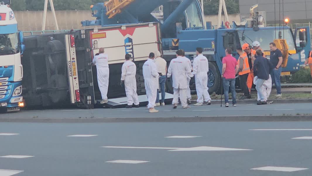 Koelvrachtwagen op z’n kant: ‘Ik heb zoiets in 40 jaar nog nooit meegemaakt’
