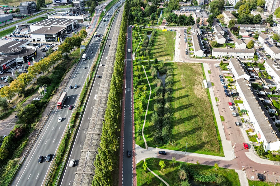 Op dit grasveld in Wielwijk, naast de A16, komen 52 flexwoningen Corrado Francke