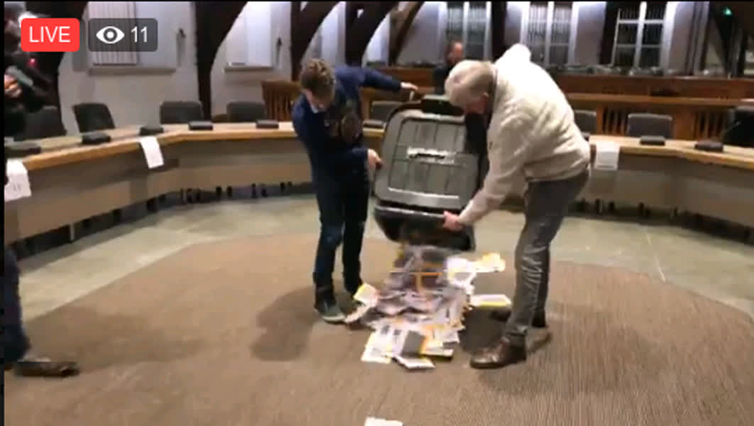 Op de foto: Het legen van de bus met referendum-formulieren in stembureau 1 in het stadhuis.