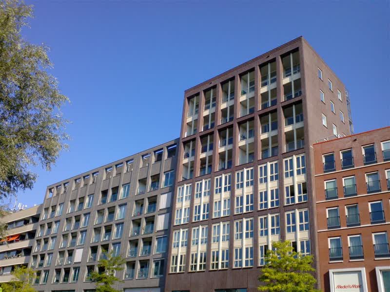 Bij een appartementencomplex boven de Mediamarkt aan de Spuiboulevard zijn woensdag steenstrips naar beneden gevallen. Ze waren onderdeel van de gevelbekleding.