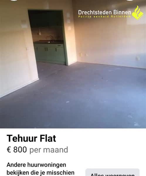 Politie Dordrecht heeft de afgelopen week vier verdachten (17, 21, 24 en 31 jaar oud) aangehouden. Via Facebook boden ze huurwoningen aan, terwijl deze van woningcorporaties waren. De woningen stonden op dat moment leeg om verbouwd te worden.