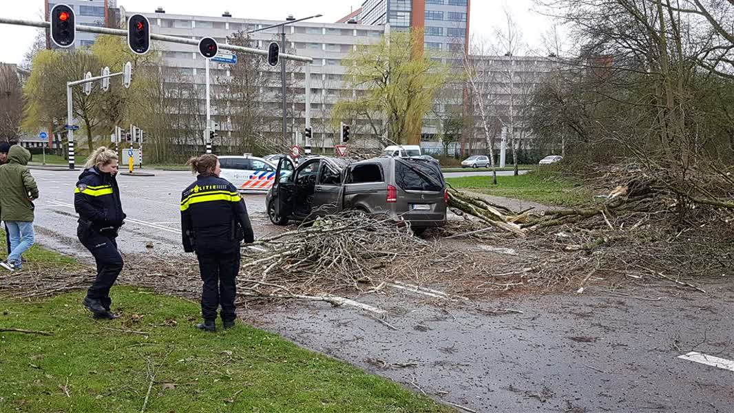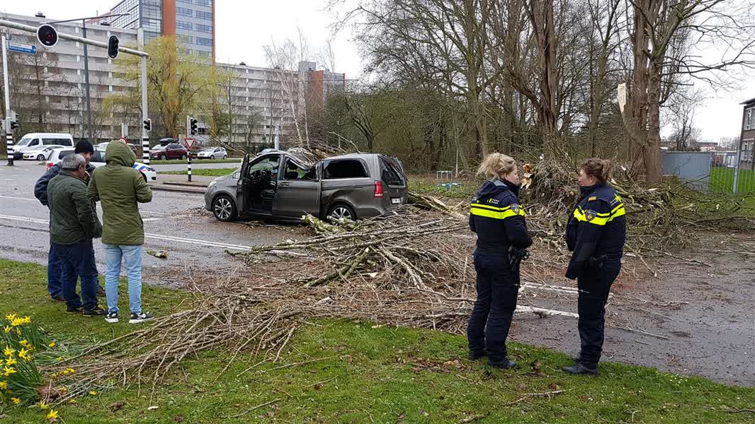 Op de S.M. Hugo van Gijnweg viel een boom op een rijdende auto. Een van de inzittenden zou een zere rug hebben en is naar het ziekenhuis gebracht.