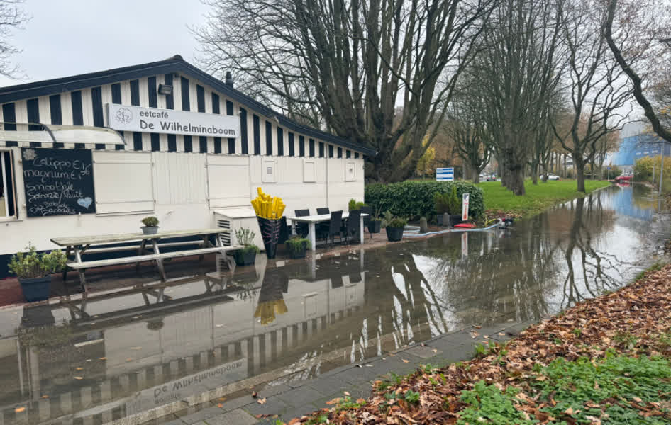 Voor Monique van Esseveld, eigenaresse van restaurant De Wilhelminaboom, was het alle hens aan dek om het water buiten haar deur te houden. "Het water kwam zo enorm hoog, het leek wel een fontein", vertelt ze aan Rijnmond. "Heel mijn terras staat nu blank. Er is een beetje water ook naar binnengelopen, maar er werden op tijd zandzakken gebracht die de rest van het water nu tegenhouden."