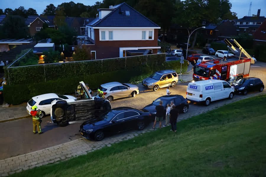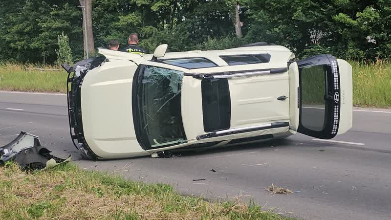 Een elektrische auto is dinsdagochtend op zijn kant beland in Dordrecht. Het ongeluk gebeurde rond 0...