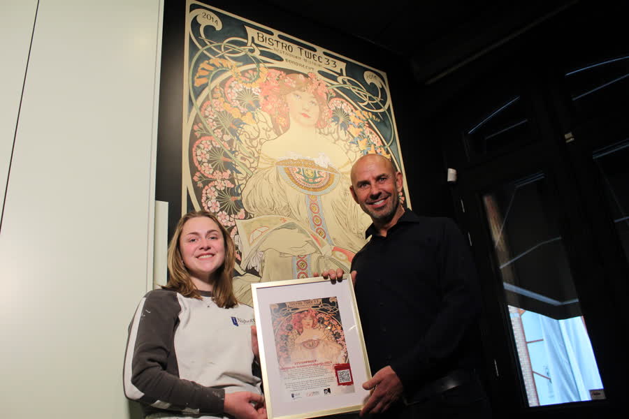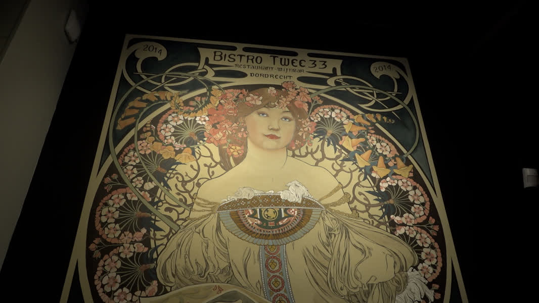 De twee jonge schilders, werkzaam bij schildersbedrijf Nijhoff, hebben van niets iets gemaakt. Ze begonnen met een volledig witte muur en toverden deze in een maand om tot een echt blikvanger voor het restaurant, waar het Art Nouveau-kunststuk van de Tsjechische kunstenaar Alphonse Mucha nu prijkt.