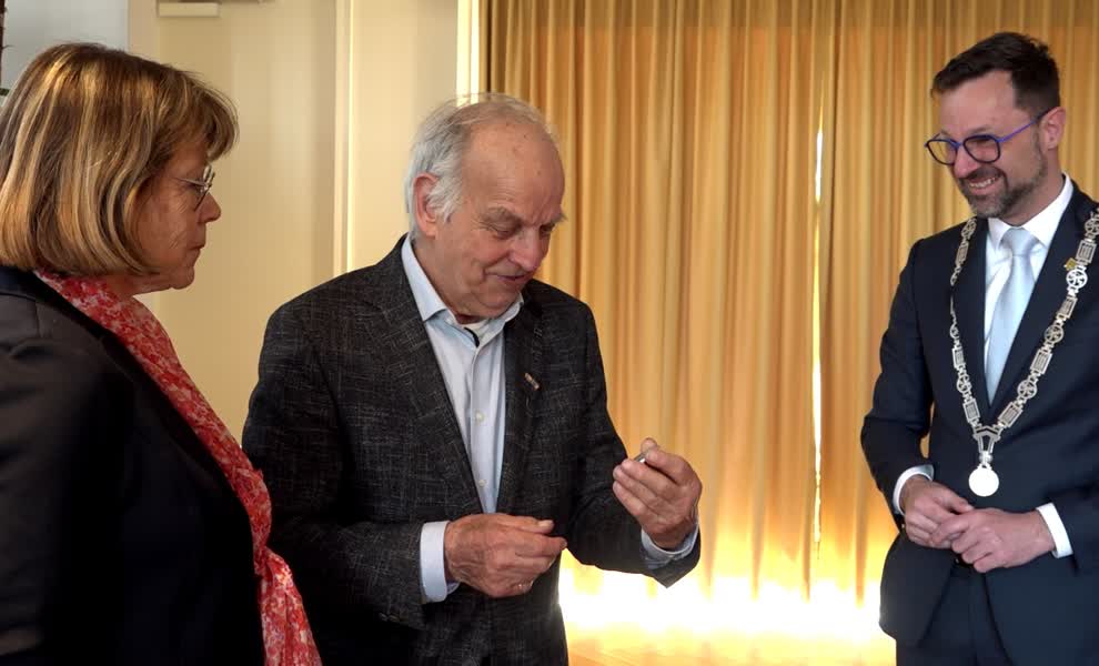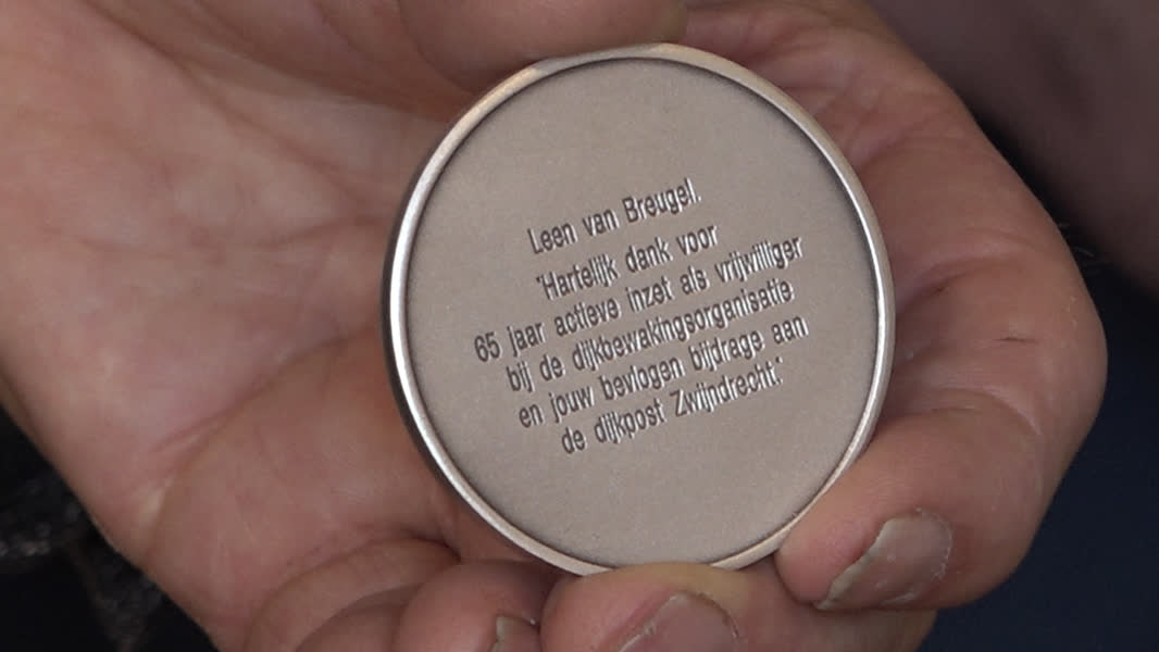 Van Breugel krijgt vervolgens de 'waterschapspenning' uitgereikt uit handen van Rijsdijk, na eveneens een dankwoord van de burgemeester. De onderscheiding is een bekroning op zijn 65 jaar durende inzet als dijkwachter. Vol trots toont hij het doosje met de zilveren munt erin aan de aanwezigen. "Ik ben er zeer van onder de indruk", zegt hij lachend.