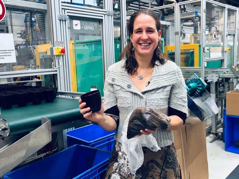 De korrels brengt ze naar een spuitgieterij naast het gemeentehuis. De korrels worden daar gesmolten en geperst tot bekers. Er rollen niet alleen bekers van de band. Er zijn nu ook plantenpotten van koffiedik.
