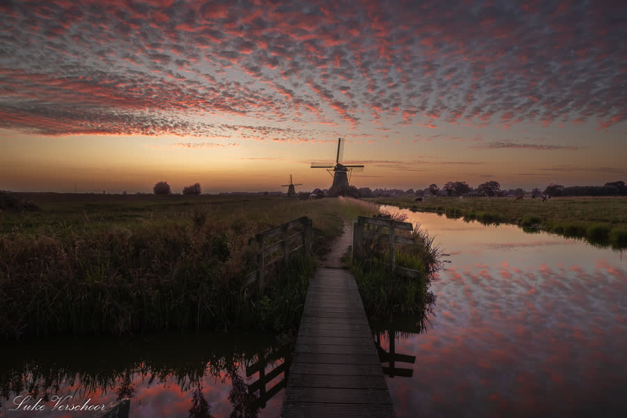 Naast kennis, heeft een astrofotograaf ook genoeg geduld nodig. Met zijn ‘neef, tuinstoelen, dekens en wat te eten’ is Luke van 23.30 uur tot 05.00 uur voor de meteoorregen gaan zitten. “Het was een windstil, mooi plekje met kans op reflectie in het water”, vertelt hij over de broekmolen in Streefkerk. “Dingen als molens, tulpenvelden of hooibalen geven veel sfeer. En ik woon natuurlijk in de buurt.”