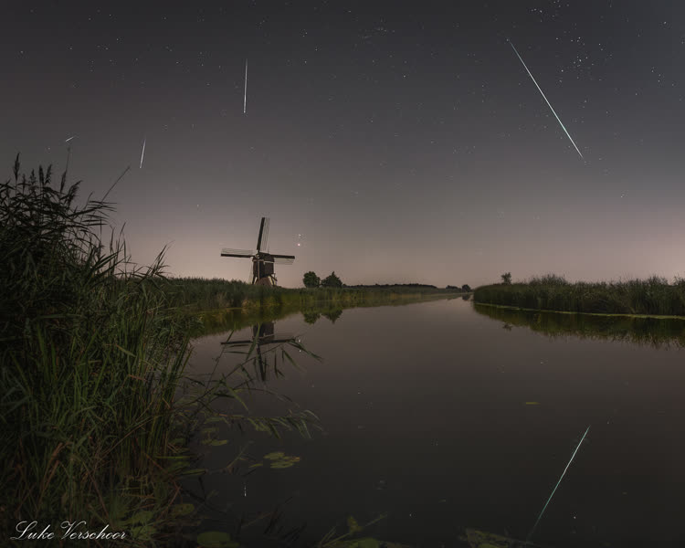 Op de foto zijn ook de planeten Jupiter en Venus te zien: “Die staan naast de rechterwiek van de molen, als twee stipjes”. De uiteindelijke foto is een soort collage van alle mooie kiekjes van Luke. “Ik heb de foto van de grote meteoriet en een andere waar ze weerspiegelen in het water als achtergrond gebruikt. Daarin heb ik dan andere foto’s verwerkt, met de meteorieten op verschillende plekken.” Zo is een hele nacht aan vallende sterren in één opslag te zien.