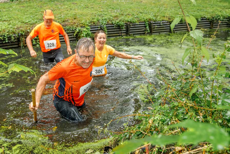 Mannen en vrouwen die in bomen klauteren, die met elkaar worstelen in de modder en die een boomstam ...