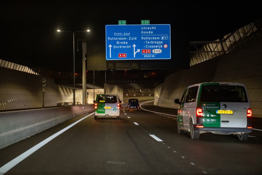 Op foto's is te zien dat er een stoet met auto's over de A16 en door de Rottemerentunnel rijdt. Voorop rijden twee auto's van Rijkswaterstaat en een oldtimer.