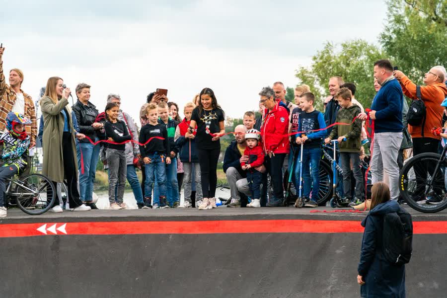 Wethouder Fleur Stip hield een korte toespraak en daarna mocht de kinderburgemeester Maya van den Ham de pumptrack officieel openen door een rood lint door te knippen.
