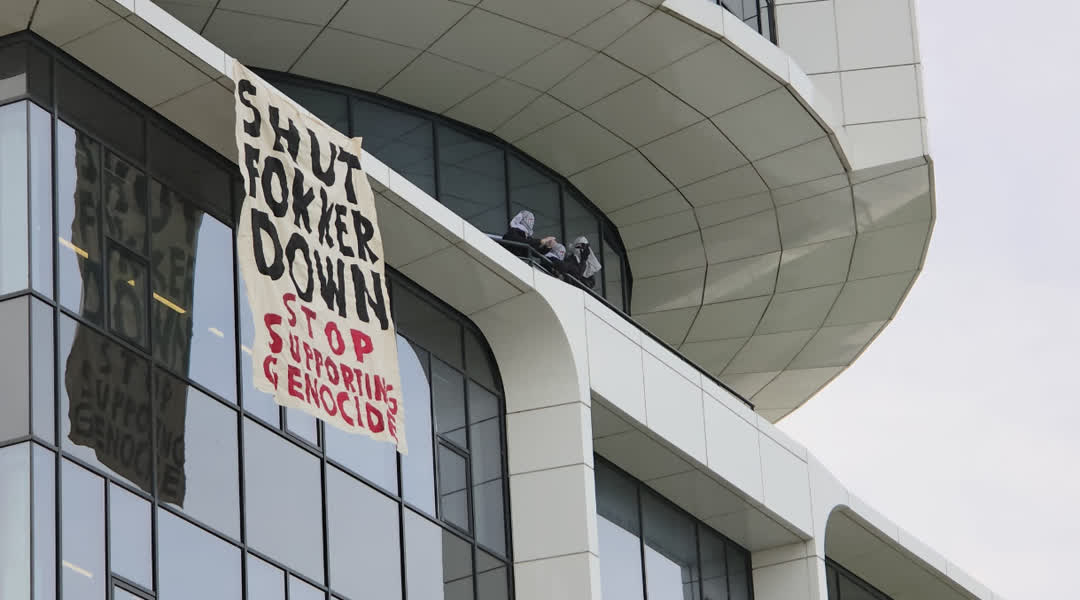 De activisten zijn van de actiegroep ‘Fok Fokker’. Zij eisen dat de fabrikant van vliegtuigonderdelen stopt met de productie en export van F-35-onderdelen. De demonstranten gaan er vanuit dat deze onderdelen via de Verenigde Staten uiteindelijk in Israël terechtkomen.