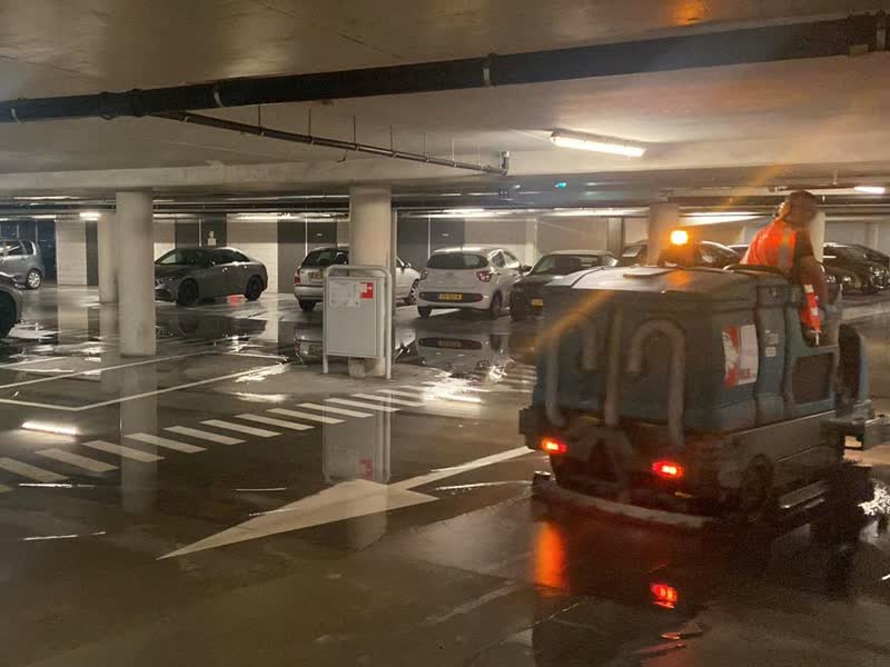 Echt erg vindt ze het niet. “Ze zijn er daar volgens mij mee bezig.” Met een dweilwagen wordt het water in de parkeergarage langzaam opgedweild.