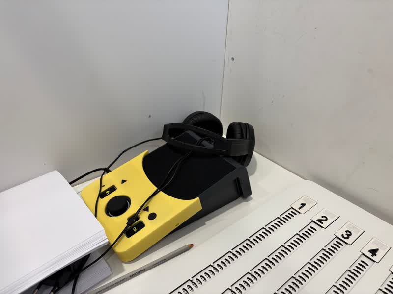 Op de tafel in het speciale loket ligt een grote houden plaat met daarin honderden gaatjes. “Daaronder leggen we een stembiljet en dan corresponderen die gaatjes met de intekenbare vakjes op het biljet”, legt Vos uit. “In braille staan de namen van de kandidaten op de plaat. Zo kunnen de stemmers voelen waar ze moeten tekenen.” Voor wie het braille niet machtig is staat er verderop nog een extra hulpmiddel, een audio-apparaat.