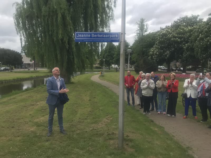 "Men dacht oorpronkelijk aan een plantsoen", laat wethouder Robert Kreukniet tijdens de onthulling op bevrijdingsdag aan radiopresentator Ben Corino van Studio De Witt weten. Bij de onthulling werd echter duidelijk dat er toch iets groter gedacht is. Het stuk groen met vijver tussen de Willem van Oranjelaan en de Juliana van Stolbergstraat draagt namelijk nu de naam van de verzetsheldin van weleer: het Jeanne Berkelaarpark.