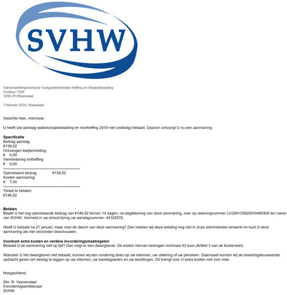 De SVHW waarschuwt op haar website voor een nepmail over een aanmaning voor de betaling van rioolbelasting. De SVHW is de organisatie die lokale belastingen int voor 13 gemeenten en waterschap Hollandse Delta.