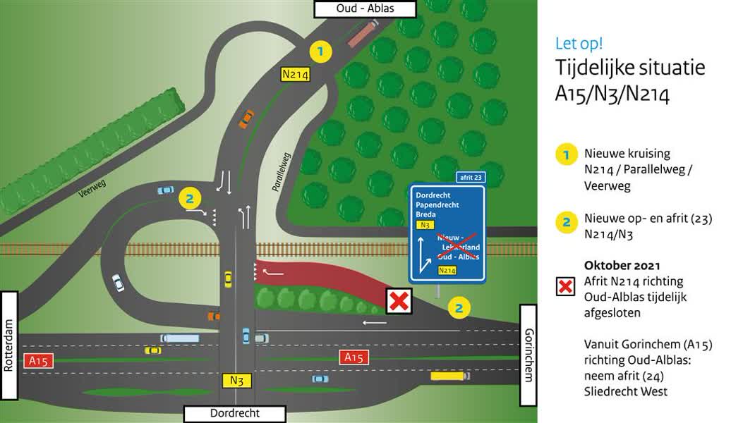 De nieuwe lus in afrit 23 vanaf de A15 (vanuit Gorinchem) naar de N3 wordt donderdagochtend vanaf 5.00 uur in gebruik genomen. De afrit naar de N214 richting Nieuw-Lekkerland en Oud-Alblas is vanaf woensdagavond 21:00 uur tot medio november afgesloten.
