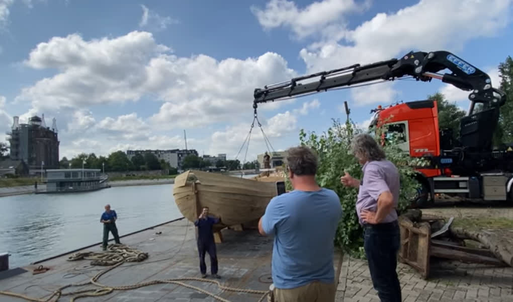 Het duurde allemaal even, maar na drie uur zwoegen en zweten stond de tjalk van kunstproject 'Rivier, Boot, Stad' dinsdagmiddag eindelijk op het ponton van Van der Wees om aan een nieuw hoofdstuk te beginnen. Het schip moet over anderhalve maand door de monumentale muur van de tuin van het Dordrechts Museum breken.