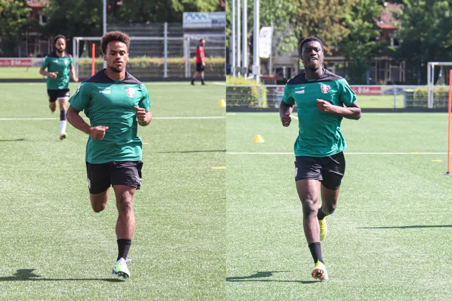 Hilton (links) en Owusu (rechts) maandag op het trainingsveld bij FC Dordrecht Corrado Francke